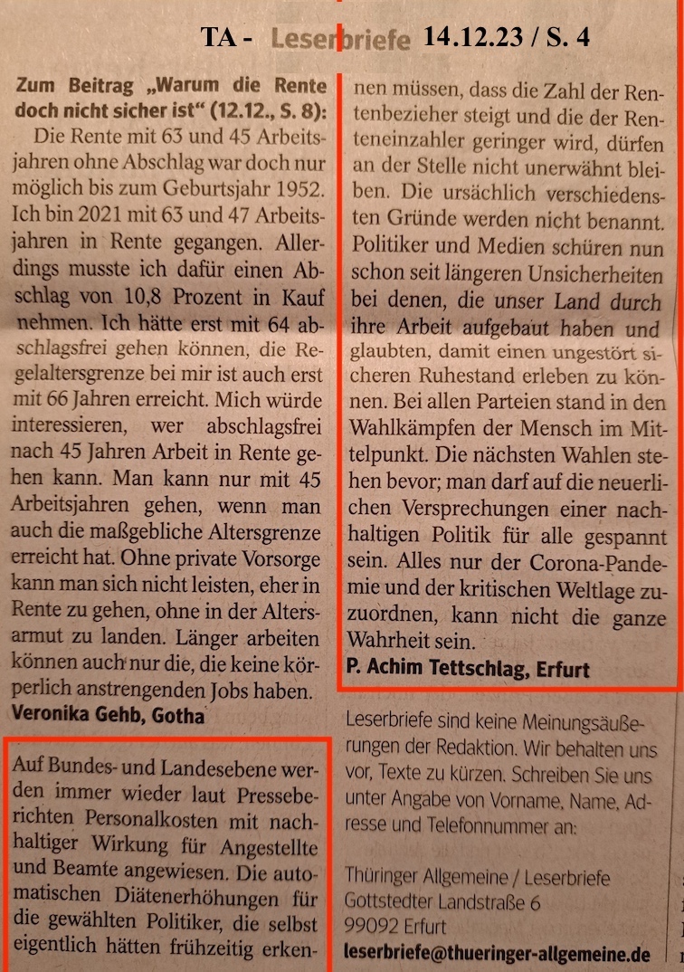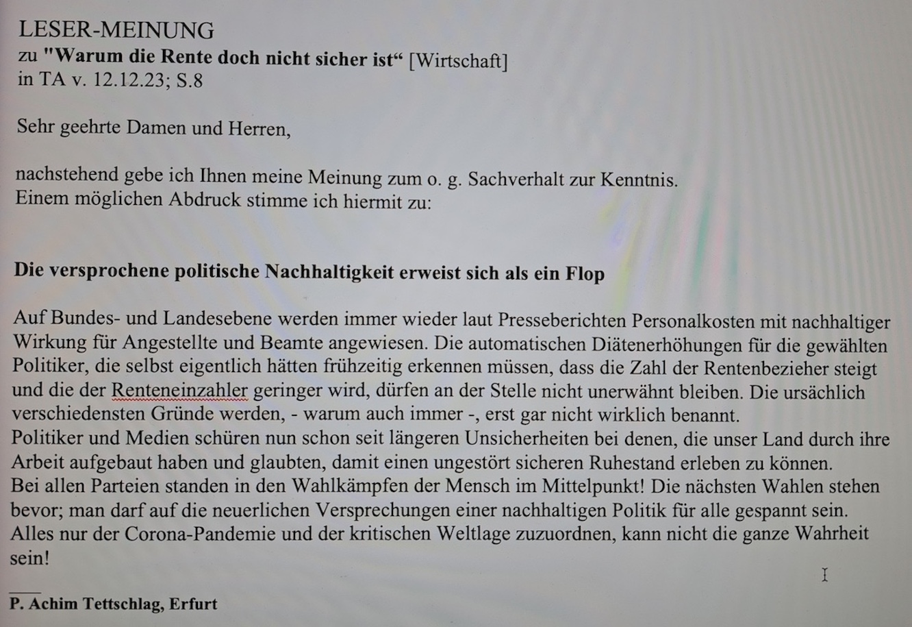 Auf Bundes- und Landesebene werden immer wieder laut Presseberichten Personalkosten mit nachhaltiger Wirkung für Angestellte und Beamte angewiesen. Die automatischen Diätenerhöhungen für die gewählten Politiker, die selbst eigentlich hätten frühzeitig erkennen müssen, dass die Zahl der Rentenbezieher steigt und die der Renteneinzahler geringer wird, dürfen an der Stelle nicht unerwähnt bleiben. Die ursächlich verschiedensten Gründe werden, – warum auch immer -, erst gar nicht wirklich benannt. Politiker und Medien schüren nun schon seit längeren Unsicherheiten bei denen, die unser Land durch ihre Arbeit aufgebaut haben und glaubten, damit einen ungestört sicheren Ruhestand erleben zu können. Bei allen Parteien standen in den Wahlkämpfen der Mensch im Mittelpunkt! Die nächsten Wahlen stehen bevor; man darf auf die neuerlichen Versprechungen einer nachhaltigen Politik für alle gespannt sein. Alles nur der Corona-Pandemie und der kritischen Weltlage zuzuordnen, kann nicht die ganze Wahrheit sein! ___ P. Achim Tettschlag, Erfurt
