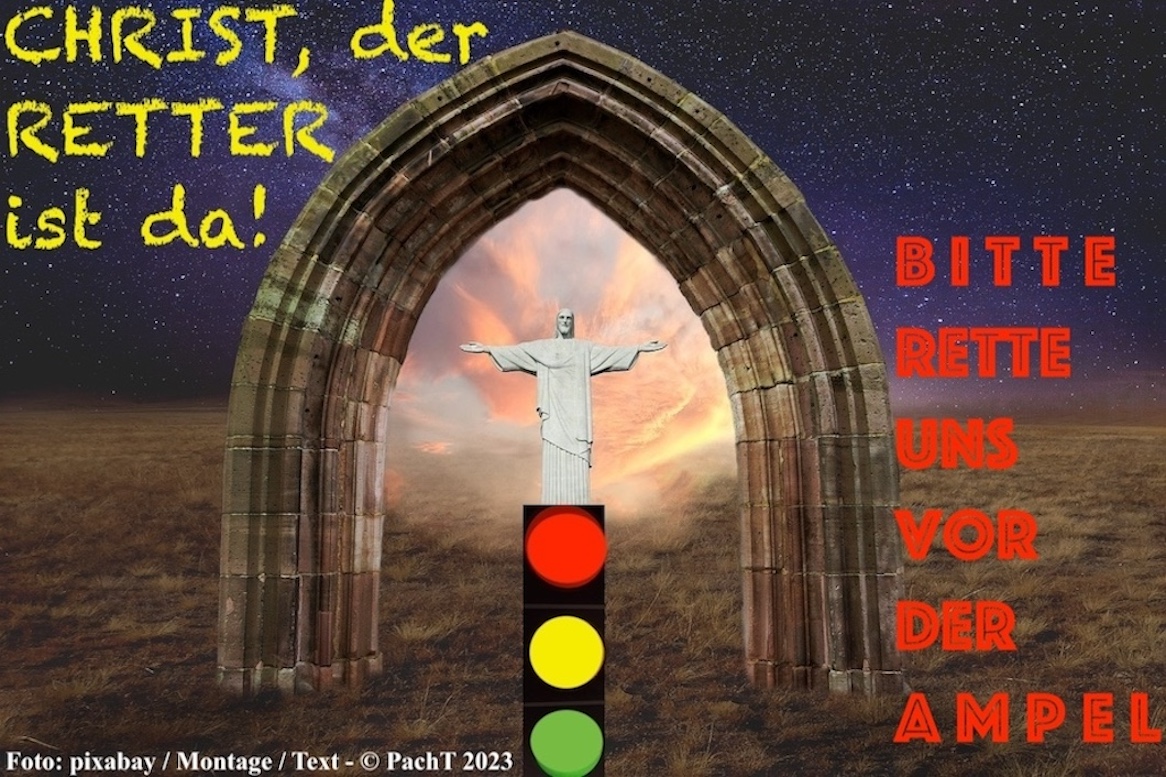 19.12.23 #CHRIST, der #RETTER ist da – ob er uns auch vor der #AMPEL retten wird ? 19. Dezember 202317. Dezember 2023PachT _ Autor / Blogger Kommentar hinterlassen IDEE @ AUSFÜHRUNG @ Text / Fotoauswahl @Montage © PachT Klicke, um auf X zu teilen (Wird in neuem Fenster geöffnet) X Klick, um auf Facebook zu teilen (Wird in neuem Fenster geöffnet) Facebook Gefällt mir Wird geladen …