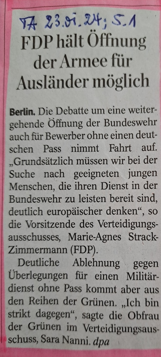 Noch traumatisiert vom KRIEGSGESCHEHEN oder geflüchtet vom WEHRDIENST in der HEIMAT, mit mangelnden SPRACHKENNTNISSEN und zum EINSATZ als FACHKRÄFTE in der WIRTSCHAFT nicht geeignet sollen FLÜCHTLINGE die MÖGLICHKEIT erhalten, sich in der BUNDESWEHR zu bewähren. Wird so unser LAND sicherer?