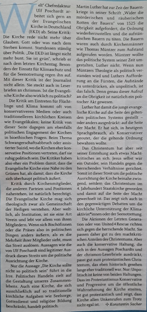 Vielen Dank für Ihre Mail, wir freuen uns sehr, dass das Thema „Kirche und Politik“ so viele Menschen beschäftigt und zur Diskussion anregt. Wegen der Fülle der Zuschriften können wir nicht alle einzeln beantworten, werden aber einige in unserer Abo-Ausgabe „chrismon plus“ abdrucken.