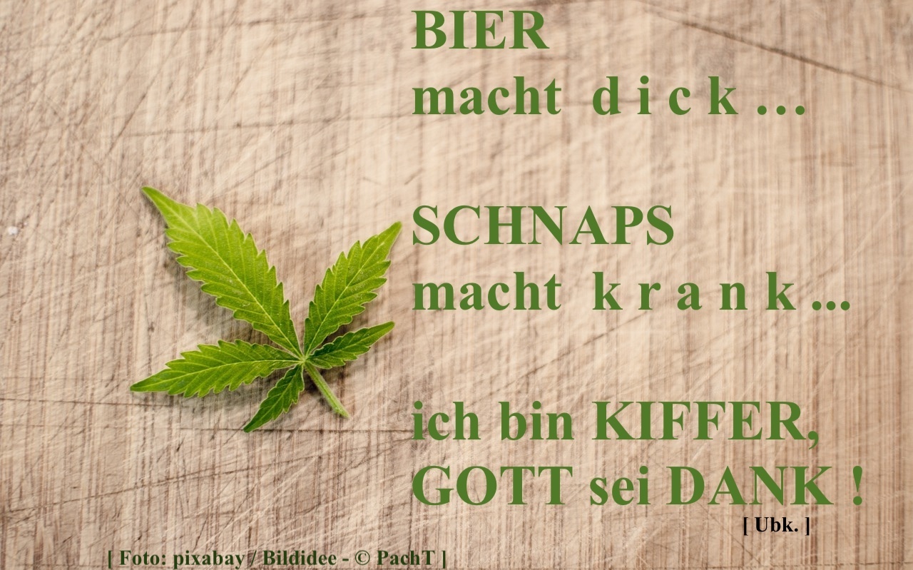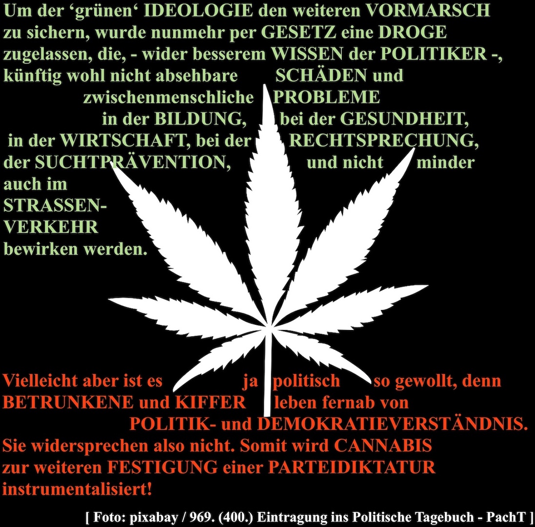 Der GESETZGEBER legalisierte dieser Tage die DROGE “CANNABIS“. Ich fragte mich: WIESO? 9,1 Mio. ALKOHOLSÜCHTIGE verursachen bereits im Jahr SCHÄDEN von rd. 57 Mrd. EURO durch immense MEHRAUFWENDUNGEN im GESUNDHEITSWESEN, ARBEITS- und VERKEHRSUNFÄLLE sowie PERSONALKOSTEN in der SUCHTPRÄVENTION usw. Meine ersten GEDANKEN zu dieser politischen ENTSCHEIDUNG habe ich mit der 969. (400.) EINTRAGUNG in mein Politisches TAGEBUCH formuliert: