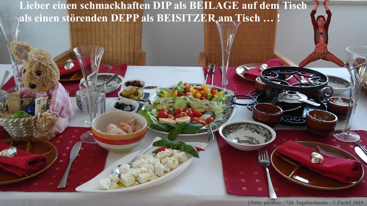 29.10.24 Meine #GEDANKEN rund ums #ESSEN 29. Oktober 202429. Oktober 2024PachT _ Autor / Blogger Kommentar hinterlassen Gedanken GEDANKEN kommen und gehen –welche bleiben?___© PachT 2008*** Geschmack Wasaus der FERNEbetrachtet,l e c k e r aussieht,mussvor Ortgegessen,nicht auch lecker schmecken!___© PachT 2009Gedanke zu einem mir per Mail aus den USA übersandten Rezepts.*** Peinliches Denken Wer mit vollem MUND laut denkt,dem können schon malpeinliche WORTFETZENaus dem GESICHT fallen …___© PachT 2015SSW 450*** TellerRand Der „eigene TELLERRAND“ist ein sehr oft gebrauchter BEGRIFF,um jemanden dezentan seine HORIZONTERWEITERUNG zu erinnern …___© PachT 2016SSW 481*** AlltagsAufwand O h n e honorige KOSTENk e i n e bekömmliche KOST!___© PachT 2016SSW 485*** TischGedanke Lieber einen schmackhaften DIPals BEILAGE auf dem Tischals einen störenden DEPPals BEISITZER am Tisch … !___© PachT 2019SSW 720Gedanke nach dem Lesen eines Rezeptes*** “Und welches GERÜCHT steht heute auf dem SPEISEPLAN?“[G.W. H.] IDEE @ AUSFÜHRUNG @ Text / Fotos&Auswahl @© PachT Klicke, um auf X zu teilen (Wird in neuem Fenster geöffnet) X Klick, um auf Facebook zu teilen (Wird in neuem Fenster geöffnet) Facebook Gefällt mir Wird geladen …