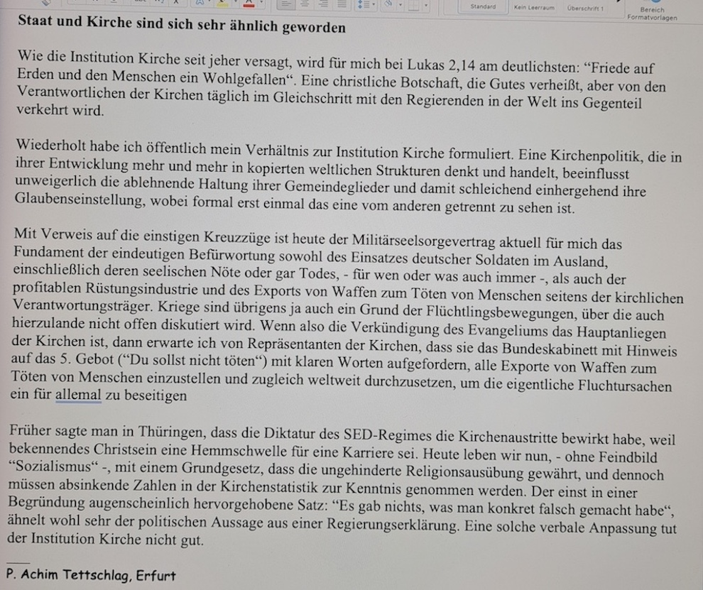 Früher sagte man in Thüringen, dass die Diktatur des SED-Regimes die Kirchenaustritte bewirkt habe, weil bekennendes Christsein eine Hemmschwelle für eine Karriere sei. Heute leben wir nun, – ohne Feindbild “Sozialismus“ -, mit einem Grundgesetz, dass die ungehinderte Religionsausübung gewährt, und dennoch müssen absinkende Zahlen in der Kirchenstatistik zur Kenntnis genommen werden. Der einst in einer Begründung augenscheinlich hervorgehobene Satz: “Es gab nichts, was man konkret falsch gemacht habe“, ähnelt wohl sehr der politischen Aussage aus einer Regierungserklärung. Eine solche verbale Anpassung tut der Institution Kirche nicht gut.