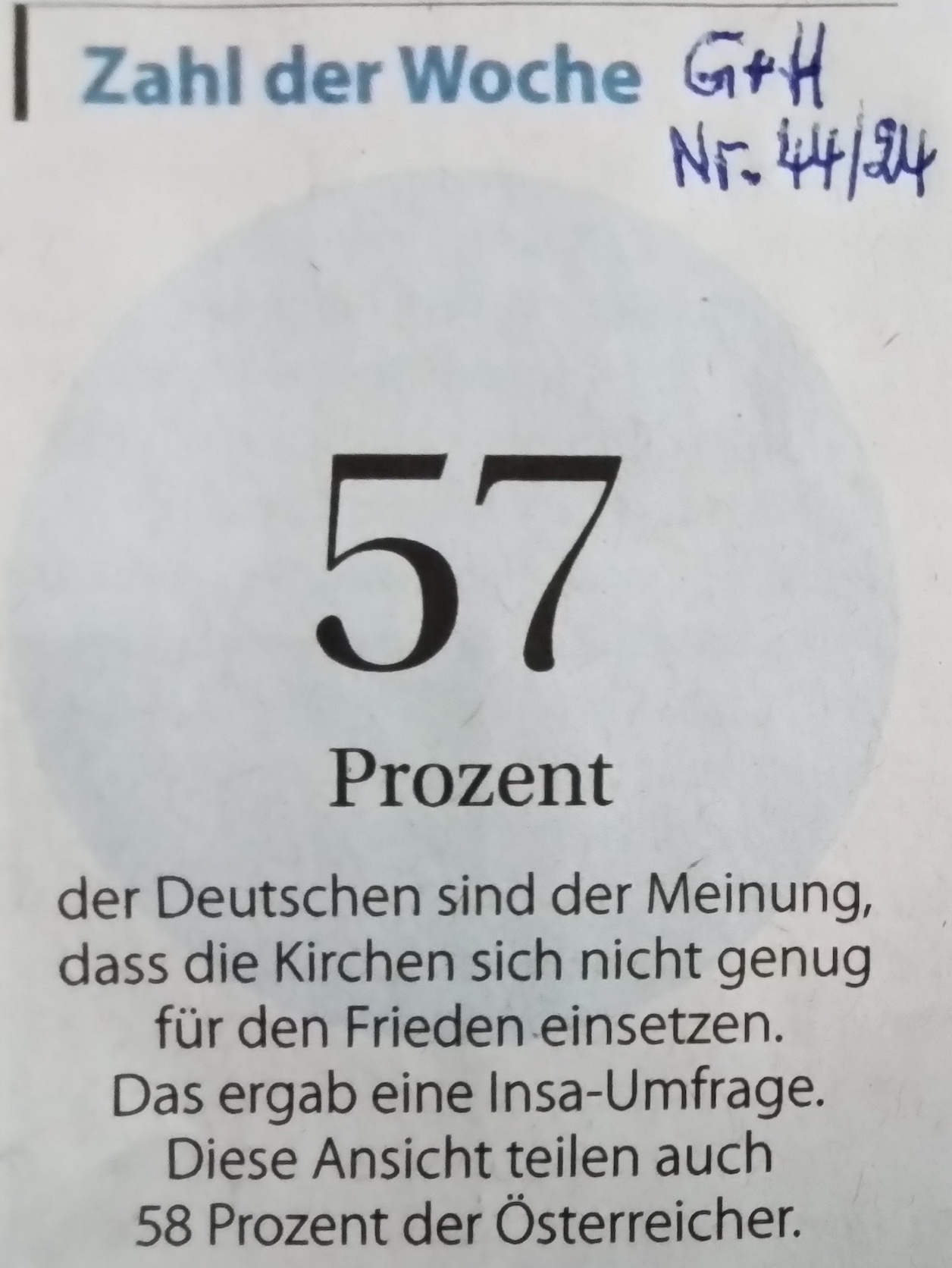 Wie die Institution Kirche seit jeher versagt, wird für mich bei Lukas 2,14 am deutlichsten: “Friede auf Erden und den Menschen ein Wohlgefallen“. Eine christliche Botschaft, die Gutes verheißt, aber von den Verantwortlichen der Kirchen täglich im Gleichschritt mit den Regierenden in der Welt ins Gegenteil verkehrt wird.