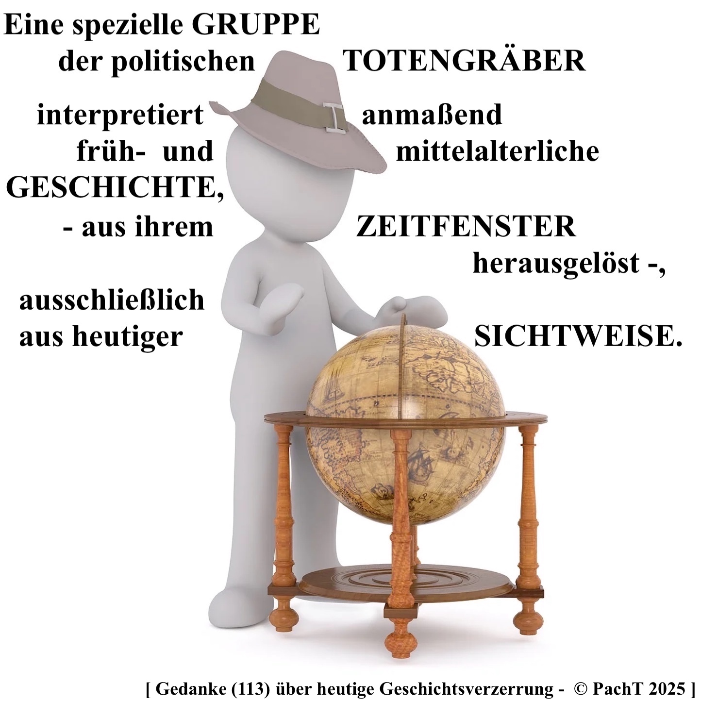 04.05.25 Das #GESCHICHTSBILD und seine #ENTSTELLUNG # 4. Mai 202529. April 2025PachT _ Autor / Blogger Kommentar hinterlassen Die GESCHICHTE lehrt die MENSCHEN, dassdie GESCHICHTE die MENSCHEN nichts lehrt. [Ubk.] Eine spezielle GRUPPE der politischen TOTENGRÄBER interpretiert anmaßendfrüh- und mittelalterliche GESCHICHTE, – aus ihrem ZEITFENSTER herausgelöst -,ausschließlich aus heutiger SICHTWEISE.___© PachT 2025Gedanke über über die Verzerrung historischer Gegebenheiten analog der damaligen Bilderstürmer.+++ Man kann alles in seinem Lebenä n d e r n – d u r c h selbst gewonnene Einsichten,aber auch erzwungene Anpassungoder letztlich selbst auferlegte Ignoranz – nur nicht seine V E R G A N G E N H E I T …___© PachT 2007*** “GESCHICHTSSCHREIBUNG ist die RACHE der ÜBERLEBENDEN.“[M. H.] IDEE @ AUSFÜHRUNG @ Text / Fotos&Auswahl@ © PachT Klicke, um auf X zu teilen (Wird in neuem Fenster geöffnet) X Klick, um auf Facebook zu teilen (Wird in neuem Fenster geöffnet) Facebook Gefällt mir Wird geladen …