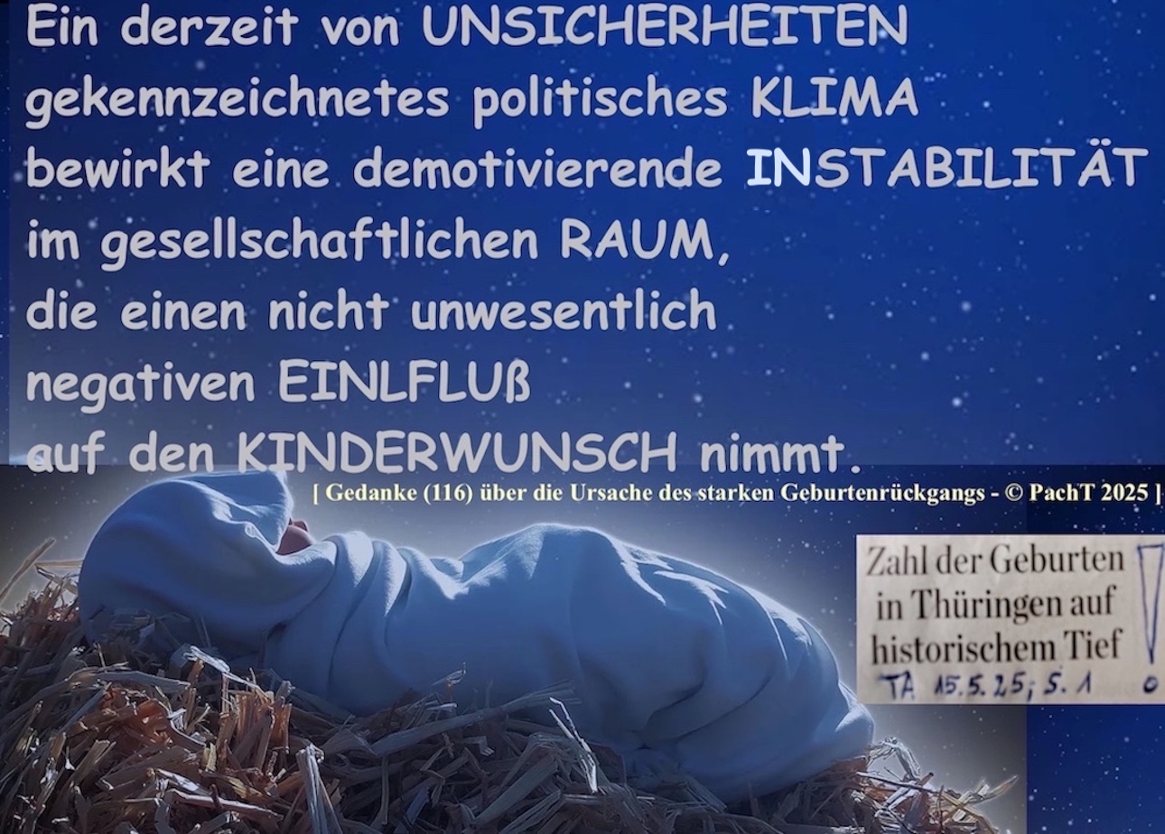 25.05.25 #KINDERWUNSCH wird derzeit durch schlechtes politisches #KLIMA gedämpft # 25. Mai 202515. Mai 2025PachT _ Autor / Blogger Kommentar hinterlassen Ein derzeit von UNSICHERHEITEN gekennzeichnetes politisches KLIMAbewirkt eine demotivierende INSTABILITÄT im gesellschaftlichen RAUM, die einen nicht unwesentlich negativen EINLFLUSS auf den KINDERWUNSCH nimmt.___© PachT 2025Gedanke über die mögliche Ursachedes starken Geburtenrückgangs*** “KINDER könnten sich an ERWACHSENEN orientieren, wenn diese sich nicht wie KINDER verhalten würden.“[St. R.] IDEE @ AUSFÜHRUNG @ Text / Fotoauswahl @ © PachT Klicke, um auf X zu teilen (Wird in neuem Fenster geöffnet) X Klick, um auf Facebook zu teilen (Wird in neuem Fenster geöffnet) Facebook Gefällt mir Wird geladen …