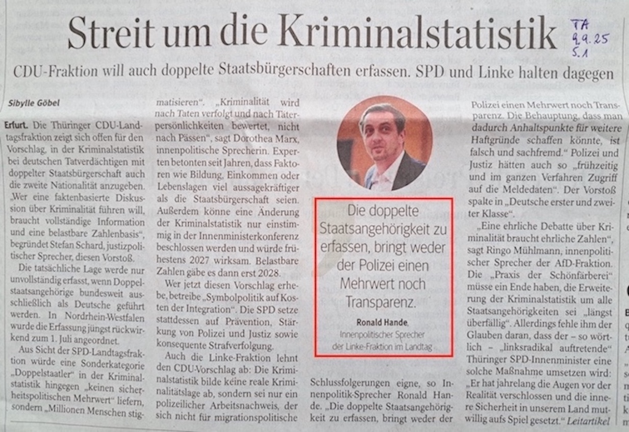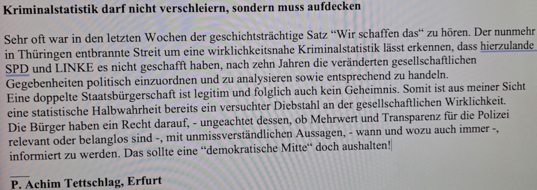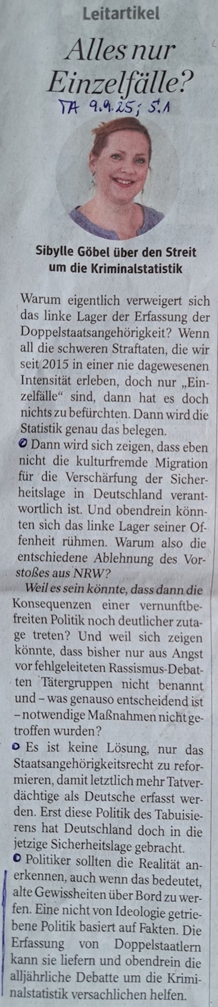 12.09.25 Die #KRIMINALSTATISTIK muss die #LAGE #zeitnah und #wirklichkeitsnah aufzeigen # 12. September 20259. September 2025PachT _ Autor / Blogger 2 Kommentare Dieser Tage in unserer REGIONALPRESSE: Meine persönliche AUFFASSUNG zum geschilderten SACHVERHALT: “STATISTIKEN sprechen eine eigene SPRACHE – die des AUFTRAGGEBERS.“[H. G.] IDEE @ AUSFÜHRUNG @ Text / Fotos @ © PachT Klicke, um auf X zu teilen (Wird in neuem Fenster geöffnet) X Klick, um auf Facebook zu teilen (Wird in neuem Fenster geöffnet) Facebook Gefällt mir Wird geladen …