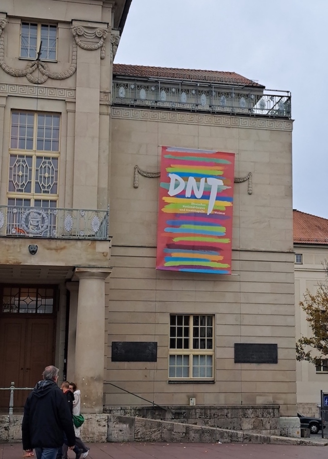 Über viele Monate wirkte der Text > DIPLOMATIE – JETZT – FRIEDEN < über dem Eingang des Weimarer Theaters für mich wie eine Botschaft des Ensembles an alle friedliebenden Menschen und Besucher. *** Nach dem Wechsel in der Führungsetage setzt das Theaterensemble offensichtlich nunmehr auf die ideologisch verordnete rot-grüne VIELFALT. ***