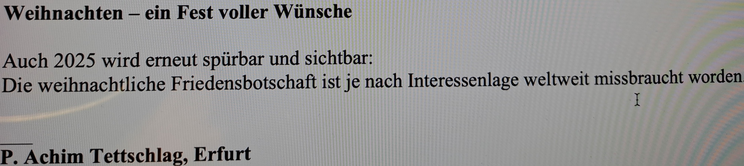 30.12.25 Weihnachtliche #NACHLESE – #Reaktion auf einen #LEITARTIKEL # 30. Dezember 202527. Dezember 2025PachT _ Autor / Blogger “Oft entscheiden die INTERESSEN wider besseres WISSEN.“[M.M. J.] IDEE @ AUSFÜHRUNG @ Text / Fotos @ © PachT Klicke, um auf X zu teilen (Wird in neuem Fenster geöffnet) X Klick, um auf Facebook zu teilen (Wird in neuem Fenster geöffnet) Facebook Gefällt mir Wird geladen … Ähnliche Beiträge