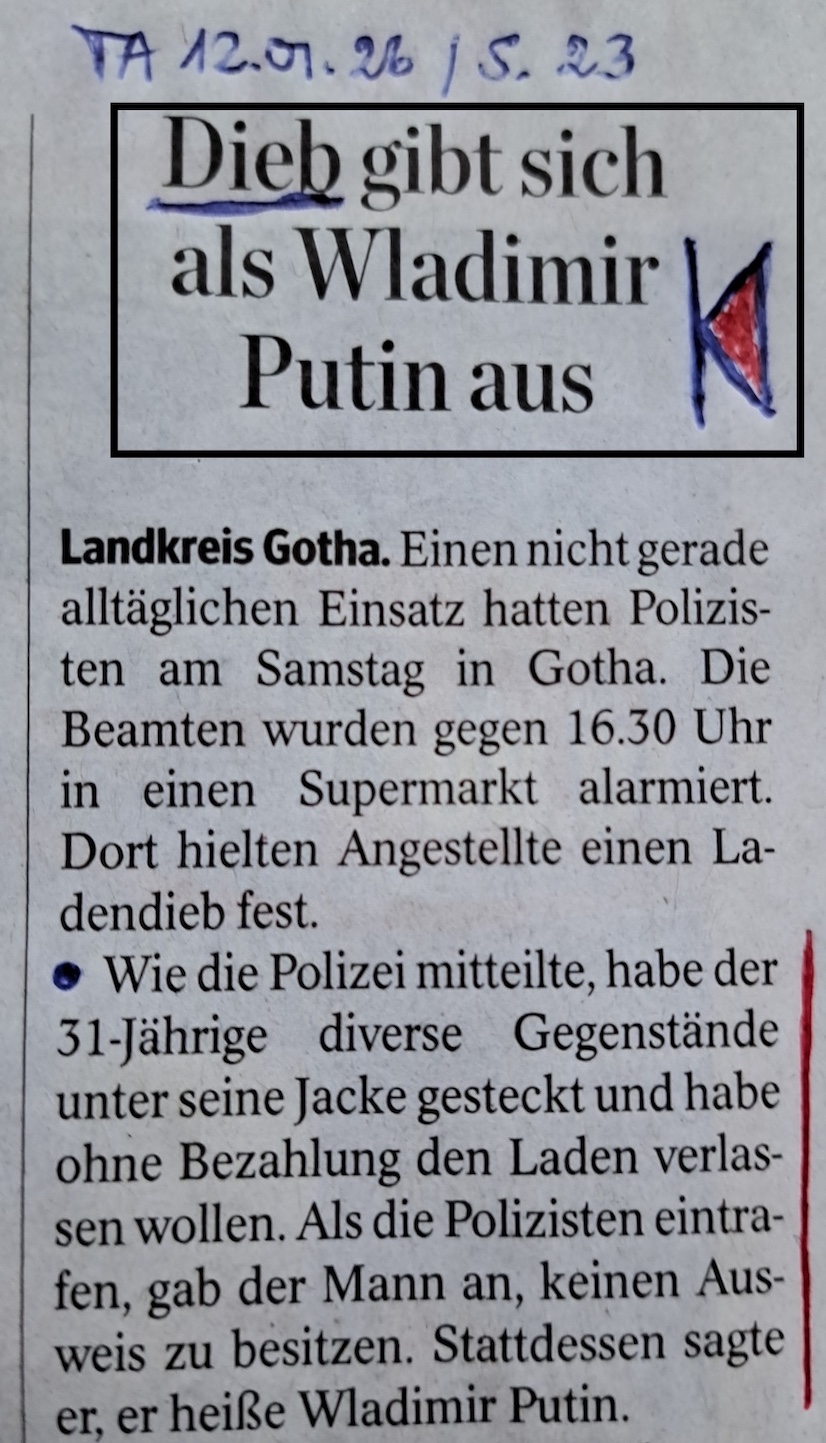 14.01.26 Der eine #verachten ihn – der andere will #PUTIN (!) sein # 14. Januar 202612. Januar 2026PachT _ Autor / Blogger Nr. 273 “Ein DIEB heißt den andern S P I T Z B U B.“[Ubk.] IDEE @ AUSFÜHRUNG @ Text / Foto&Auswahl @ © PachT Klicke, um auf X zu teilen (Wird in neuem Fenster geöffnet) X Klick, um auf Facebook zu teilen (Wird in neuem Fenster geöffnet) Facebook Gefällt mir Wird geladen … Ähnliche Beiträge