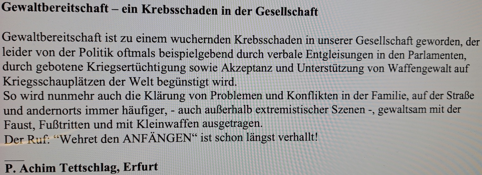 Meine Auffassung zu diesem traurigen SACHVERHALT habe ich der REDAKTION unserer REGIONALPRESSE zur KENNTNIS gegeben: