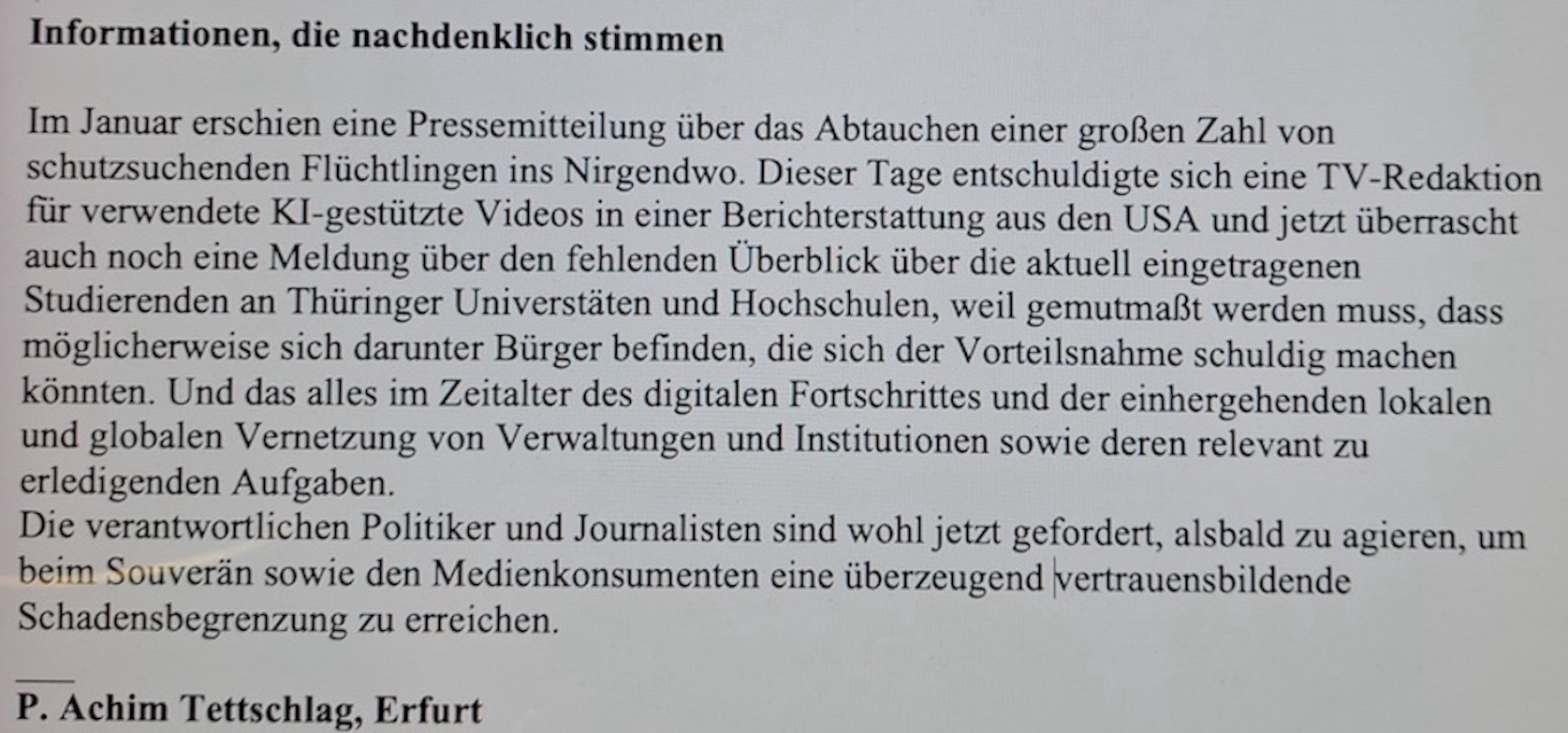 Deshalb meine Auffassung an die REDAKTION unserer REGIONALPRESSE.