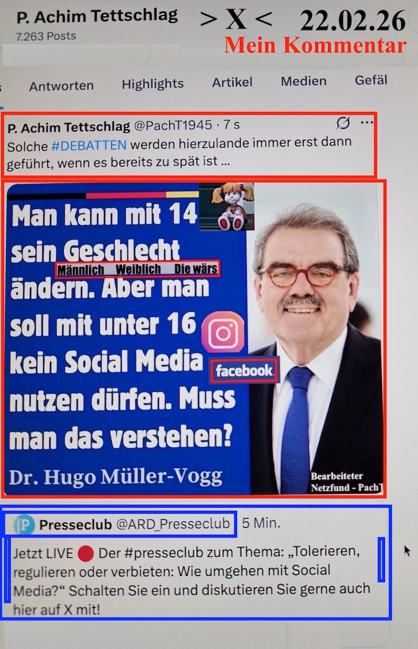 22.02.26 Mein #KOMMENTAR zum #UMGANG mit #Social_Media # 22. Februar 2026PachT _ Autor / Blogger IDEE @ AUSFÜHRUNG @ Text / Fotoauswahl @ © PachT Auf X teilen (Wird in neuem Fenster geöffnet) X Auf Facebook teilen (Wird in neuem Fenster geöffnet) Facebook Gefällt mir Wird geladen … Ähnliche Beiträge