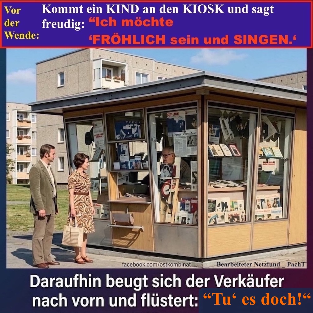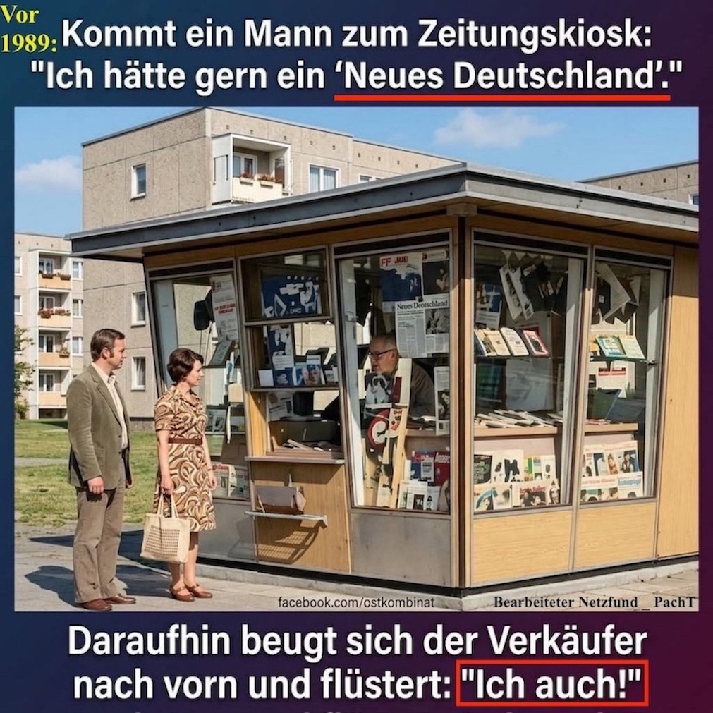 21.04.26 Am #ZEITUNGSKIOSK vor der WENDE 1989 in der #DDR # 21. April 202617. April 2026PachT _ Autor / Blogger Der erste FALL: Der zweite FALL: Im ALTER weckt jedes gute GESPRÄCH ERINNERUNGEN.“[UBK.] IDEE @ AUSFÜHRUNG @ Text / Fotoauswahl @ © PachT Auf X teilen (Wird in neuem Fenster geöffnet) X Auf Facebook teilen (Wird in neuem Fenster geöffnet) Facebook Gefällt mir Wird geladen … Ähnliche Beiträge