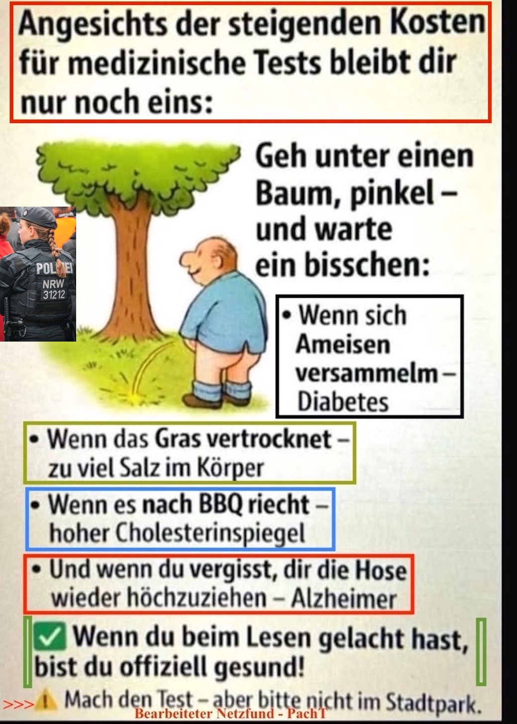 25.04.26 # Medizinischen #SELBSTTEST zwecks kassenärztlicher #KOSTENEINSPARUNG wird es künftighin geben # 25. April 202621. April 2026PachT _ Autor / Blogger LABORKOSTEN bald nicht mehr bezahlbar ?SELBSTTEST der PATIENTEN werden erwogen ! POLIZEIPRÄSENZ soll > ERREGUNG öffentlichen ÄRGERNISSES < in PARKANLAGEN verhindern. IDEE @ AUSFÜHRUNG @ Text / Fotoauswahl @ © PachT Auf X teilen (Wird in neuem Fenster geöffnet) X Auf Facebook teilen (Wird in neuem Fenster geöffnet) Facebook Gefällt mir Wird geladen … Ähnliche Beiträge