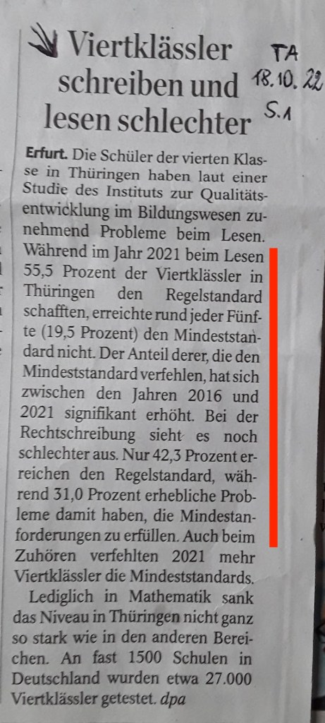 LESER-MEINUNG zu "Bildungspolitische Extrawurst“ [Wirtschaft] in TA v. 28.12.22; S. 8 Sehr geehrte Damen und Herren, nachstehend gebe ich Ihnen meine Meinung zum o. g. Sachverhalt zur Kenntnis. Einem möglichen Abdruck stimme ich hiermit zu: Barrierefrei ins Berufsleben “Schneller – höher – stärker!“ Dieser bekannte Slogan auf der Ebene des Sports von Pierre de Coubertin wurde vom deutschen IOC-Präsidenten Thomas Bach 2021 um das Attribut “gemeinsam“ erweitert. Das ist eine klare Zielvorgabe, zu deren Umsetzung es keiner Experimente bedarf. Ergebnisse politischen Kräftemessens zur Grundlage für nachhaltige bildungspolitische Entscheidungen für den Weg künftiger qualifizierter Fachkräfte erklären zu wollen, entbehrt meines Erachtens jeglicher bisher praktikablen Entwicklung. “Das Leben ist eine Prüfung – wohl dem, der die Prüfung besteht!“ – eine Lebensweisheit, die man heutzutage als banal abtut. Sie widersprechen auch wiederholt von den verantwortlichen Stellen an die Presse weitergegebenen Erfahrungen, dass die Wirtschaft um geeigneten Nachwuchs ringt, der richtig schreiben, lesen und rechnen kann, aber von den Absolventen wiederholt wegen mangelnden Erkennens erforderlicher Zusammenhänge enttäuscht wird. Darüber gibt es ja vielfältige Artikel auch in dieser Zeitung (vgl. dazu z. B. TA v. 29.04.14, 15.11.16, 10.04.19, 26.08.20). Eine Thüringer “Extrawurst“ für einen barrierefreien, - sprich prüfungsreduzierten -, Weg ins Berufsleben ist den gewachsenen Anforderungen nicht dienlich. Allerdings gibt es ja schon erwähnenswert einige Beispiele, wie Menschen ohne spezifischen Abschluss den Sprung aus dem Klassenzimmer in einen Plenarsaal, also in die Reihe der politischen Elite geschafft haben. Das Einkommen und die Alterssicherung sind gewährleistet und mögliche Fehlentscheidungen bleiben ohne Konsequenzen. Das ist fürwahr eine neue Qualität einer hürdenfreien Laufbahn. ___