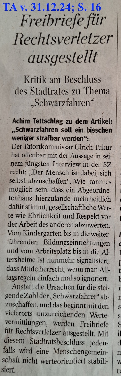 Zumindest ist mir keine BÜRGERINFORMATION bekannt, zumal dort täglich im Durchschnitt weit über 260 Fahrzeuge diese Stelle passieren ... (von denen allerdings rd. Zweidrittel entgegen der dortigen VERKEHRSREGELUNG widerrechtlich ungesühnt parken, dabei Sommer wie Winter, - sich mit dem Smartphone beschäftigend auf die Schulkinder wartend -, die Motoren laufen lassen. >> Dazu habe ich seit meinem Schreiben vom September 2022 außer >>Wir haben Ihre Nachricht erhalten und zur Bearbeitung weitergeleitet << keine ANTWORT erhalten.)