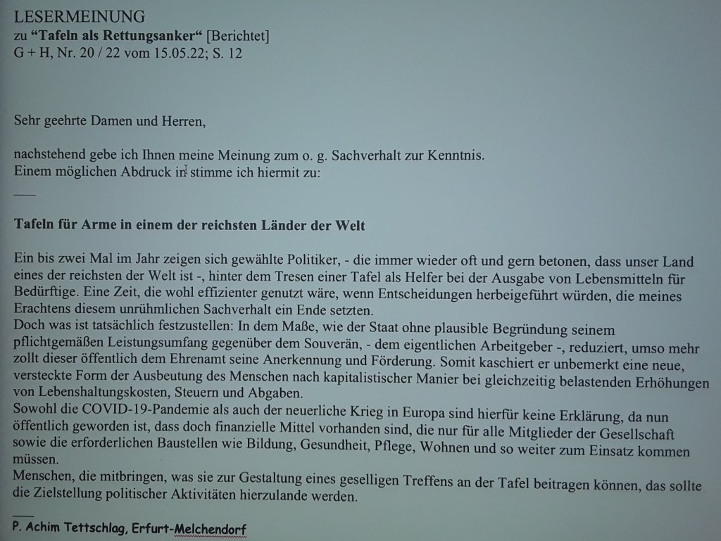 Ein bis zwei Mal im Jahr zeigen sich gewählte Politiker, - die immer wieder oft und gern betonen, dass unser Land eines der reichsten der Welt ist -, hinter dem Tresen einer Tafel als Helfer bei der Ausgabe von Lebensmitteln für Bedürftige. Eine Zeit, die wohl effizienter genutzt wäre, wenn Entscheidungen herbeigeführt würden, die meines Erachtens diesem unrühmlichen Sachverhalt ein Ende setzten.