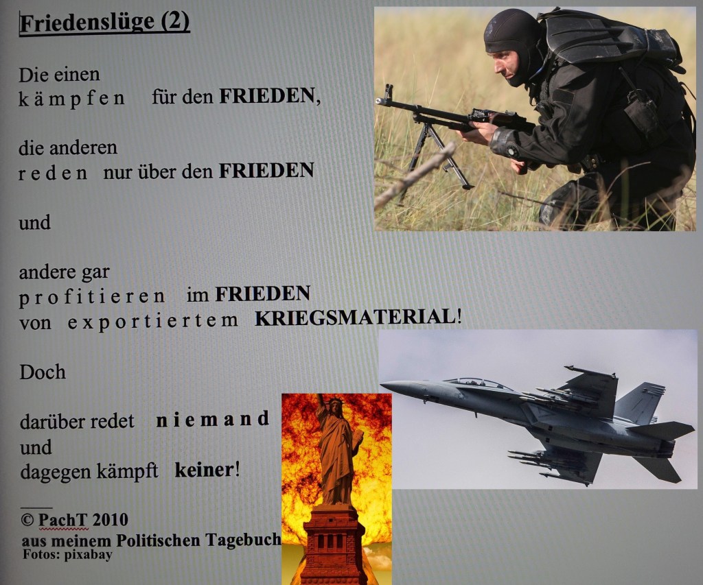 FRIEDENSLOSUNGEN gibt es allerorten, doch die FEINDBILDKONSTRUKTEURE ersticken sie immer wieder, um die WAFFENPRODUKTION und den WAFFENEXPORT stets aufs NEUE zu beleben. Der SEGEN GOTTES fehlt selbstverständlich auch nicht, denn letztendlich organisiert ja der friedliebende STAAT die EINTREIBUNG der KIRCHENSTEUER für die Institution KIRCHE. >>>Eine HAND wäscht die andere <<<