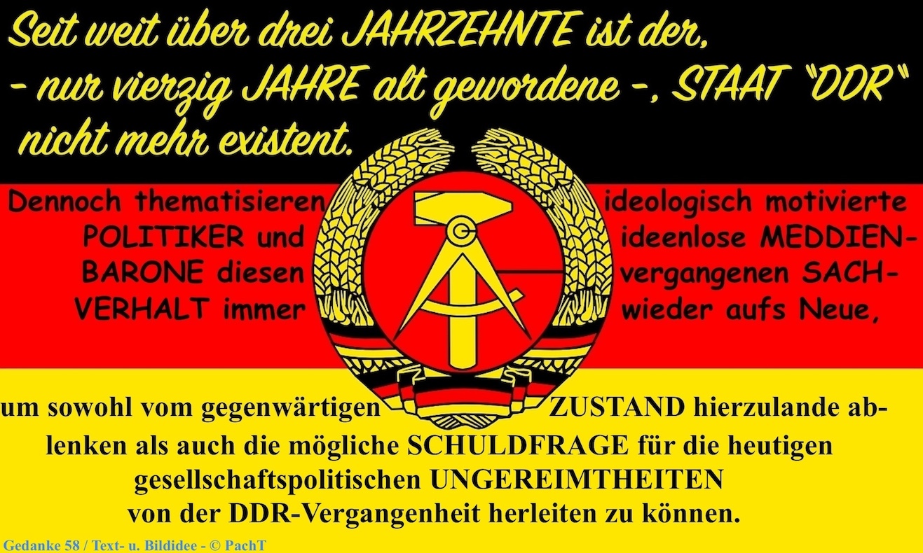 nicht mehr existent. Dennoch thematisieren ideologisch motivierte POLITIKER und ideenlose MEDIENBARONE diesen vergangenen SACHVERHALT immer wieder aufs Neue, um sowohl vom gegenwärtigen ZUSTAND hierzulande ablenken als auch die mögliche SCHULDFRAGE für die heutigen gesellschaftspolitischen UNGEREIMTHEITEN von der DDR-Vergangenheit herleiten zu können.