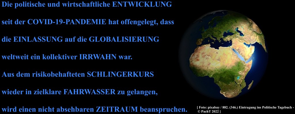 Die politische und wirtschaftliche ENTWICKLUNG seit der COVID-19-PANDEMIE hat offengelegt, dass die EINLASSUNG auf die GLOBALISIERUNG weltweit ein kollektiver IRRWAHN war. Aus dem risikobehafteten SCHLINGERKURS wieder in zielklare FAHRWASSER zu gelangen, wird einen nicht absehbaren ZEITRAUM beanspruchen. ___ © PachT 2022 SSW 882 / 346 Gedanken über die derzeitige Weltwirtschaftslage ___