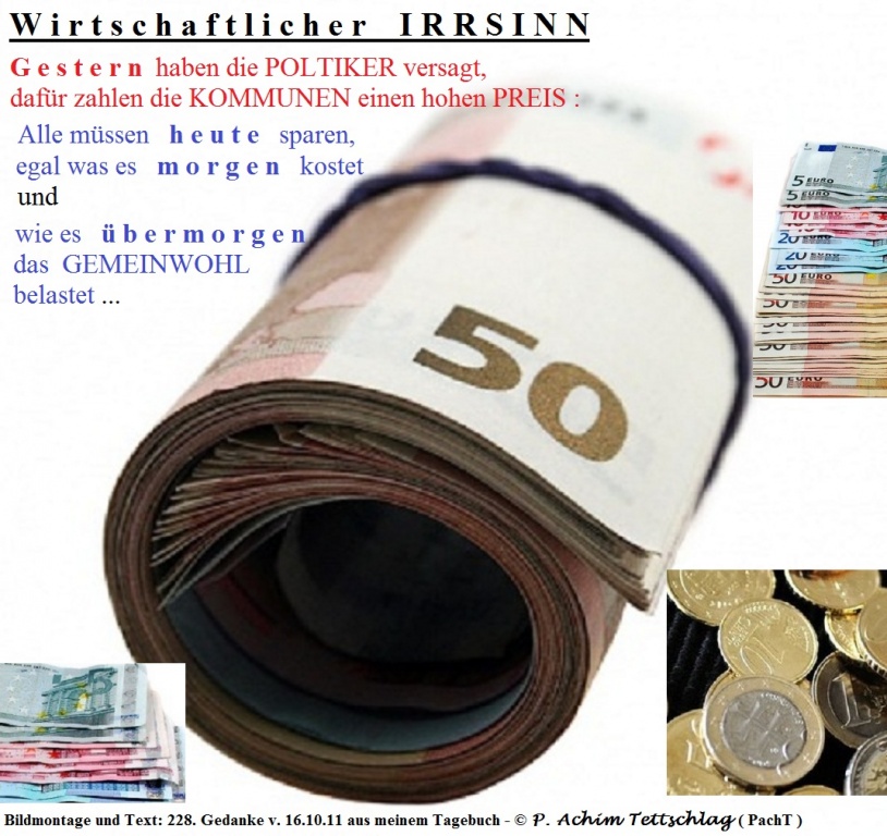 G e s t e r n haben die POLITIKER versagt, dafür zahlen die WÄHLER und KOMMUNEN einen hohen PREIS: Alle müssen h e u t e sparen, egal was es m o r g e n kostet und wie es ü b e r m o r g e n das GEMEINWOHL belastet ... ___ © PachT 2011