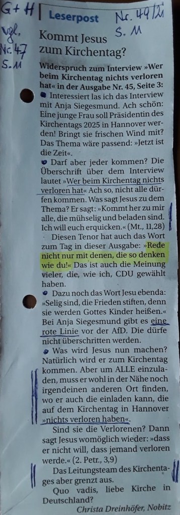Als gläubiger Christ, - zwar außerhalb der Institution Kirche -, hat mich die Botschaft der Grünen-Politikerin Anja Siegesmund als jüngst gewähltes Mitglied in das Präsidium des Ev. Kirchentages und designierte Präsidentin des Kirchentages 2025 dennoch aufgeschreckt und zugleich irritiert.