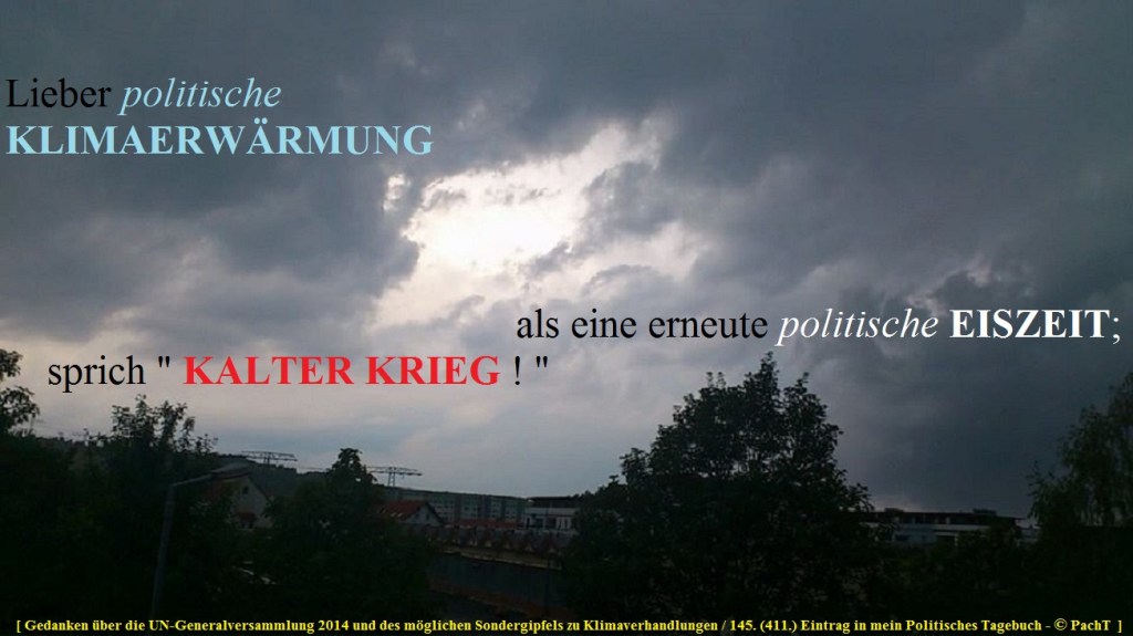 Wir leben in einer neuen Zeit des “Kalten KRIEGES“. Politiker und Journalisten verklären jede auf ihre Art, - mal übereinstimmend und mal widersprüchlich -, die Wirklichkeit. Erfahrungen und Lehren aus Krisen werden ignoriert, Erkenntnisse und Tatsachen aus Kriegen werden kaschiert und so werden noch bestehende Brücken der Verständigung wider besseren Wissens gesprengt, um die existierenden Widersprüche als Sprengstoff zur Durchsetzung der jeweils aufgebauten Absichten gegenüber dem anderen zu nutzen. * Weh denen, ... , die sich als Sieger brüsten, ... , verursachtes UNHEIL als HEIL für die Menschen erkämpft zu haben.