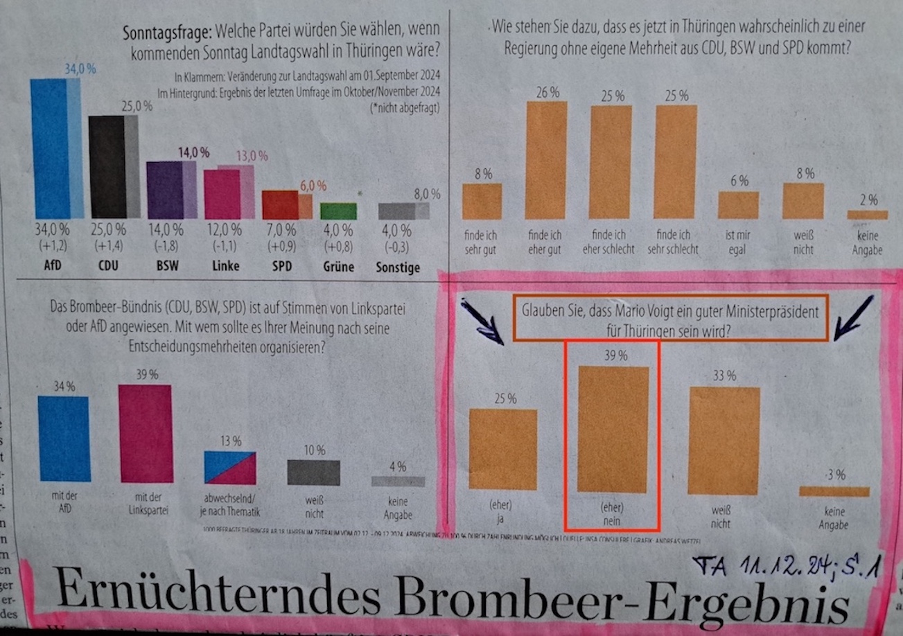 Am 12.12.24 steht im Thüringer Landtag ein Kandidat für das Amt des MINISTERPRÄSIDENTEN zur WAHL, der mit seiner Partei nur PLATZ “ 2 “ im Parteienranking erreichte und selbst das DIREKTMANDAT in seinem Wahlkreis nicht erhielt.