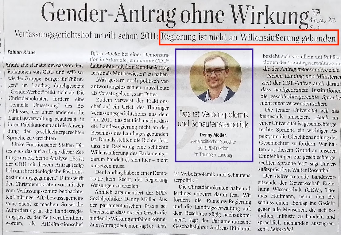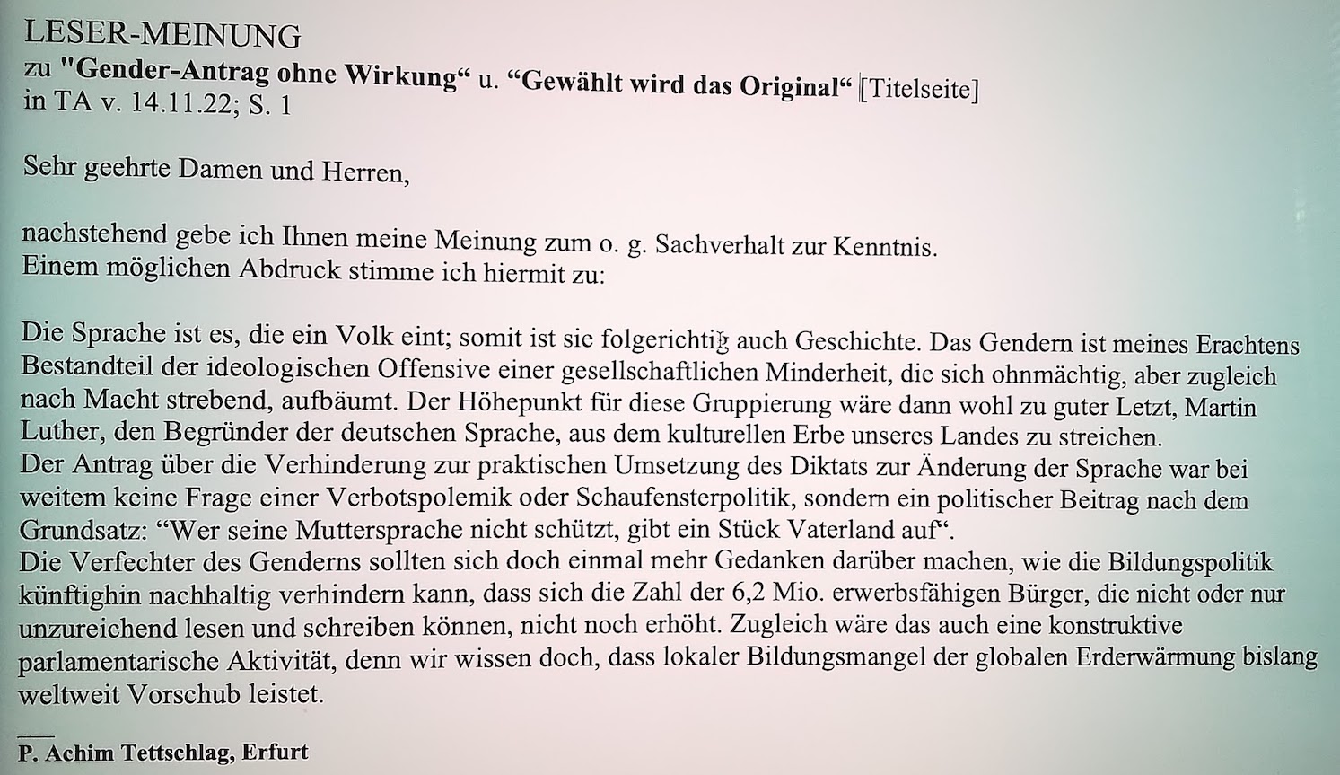 Die Sprache ist es, die ein Volk eint; somit ist sie folgerichtig auch Geschichte. Das Gendern ist meines Erachtens Bestandteil der ideologischen Offensive einer gesellschaftlichen Minderheit, die sich ohnmächtig, aber zugleich nach Macht strebend, aufbäumt. Der Höhepunkt für diese Gruppierung wäre dann wohl zu guter Letzt, Martin Luther, den Begründer der deutschen Sprache, aus dem kulturellen Erbe unseres Landes zu streichen. Der Antrag über die Verhinderung zur praktischen Umsetzung des Diktats zur Änderung der Sprache war bei weitem keine Frage einer Verbotspolemik oder Schaufensterpolitik, sondern ein politischer Beitrag nach dem Grundsatz: “Wer seine Muttersprache nicht schützt, gibt ein Stück Vaterland auf“. Die Verfechter des Genderns sollten sich doch einmal mehr Gedanken darüber machen, wie die Bildungspolitik künftighin nachhaltig verhindern kann, dass sich die Zahl der 6,2 Mio. erwerbsfähigen Bürger, die nicht oder nur unzureichend lesen und schreiben können, nicht noch erhöht. Zugleich wäre das auch eine konstruktive parlamentarische Aktivität, denn wir wissen doch, dass lokaler Bildungsmangel der globalen Erderwärmung bislang weltweit Vorschub leistet. ___