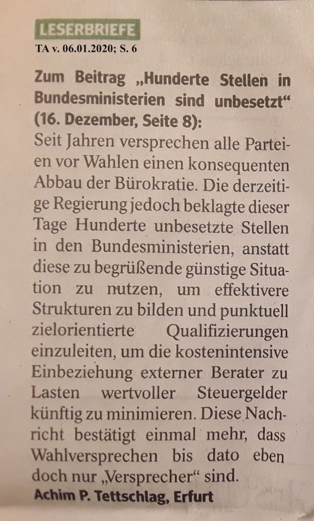 Die Thüringer CDU, bislang als STEIGBÜGELHALTER einer ROT-ROT-GRÜNEN - MINDERHEITSREGIERUNG fungierend , wird politisch von dieser vorgeführt und geht nicht dagegen an. Der LANDTAG lässt die HAUSHALTSENTSCHEIDUNGEN des KABINETTS unwidersprochen im Raum stehen. LEGISLATIVE und EXEKUTIVE versagen zum NACHTEIL des stimmlosen STEUERZAHLERS.