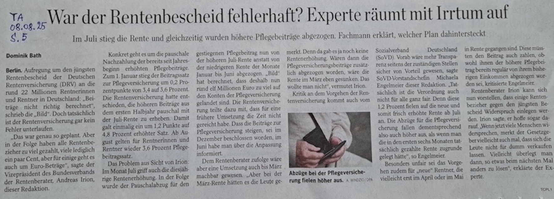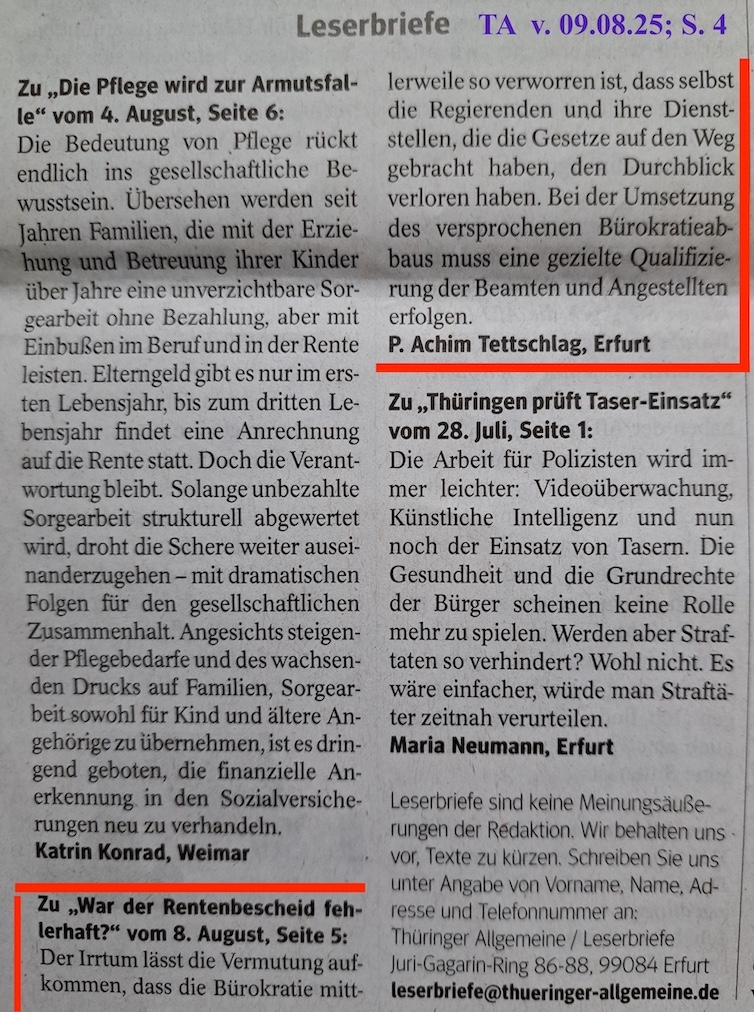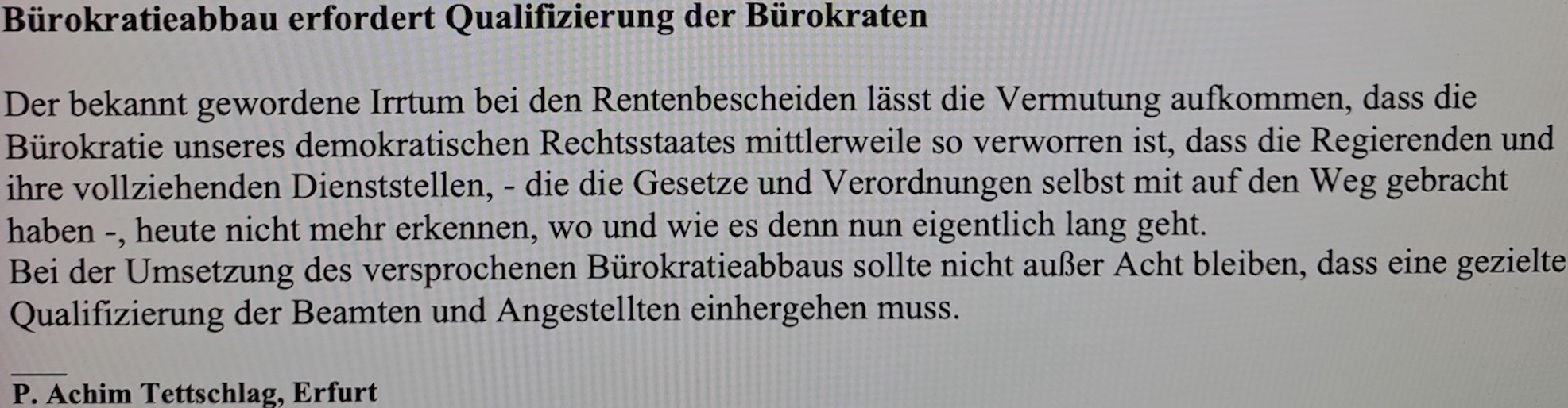 Der bekannt gewordene Irrtum bei den Rentenbescheiden lässt die Vermutung aufkommen, dass die Bürokratie unseres demokratischen Rechtsstaates mittlerweile so verworren ist, dass die Regierenden und ihre vollziehenden Dienststellen, – die die Gesetze und Verordnungen selbst mit auf den Weg gebracht haben -, heute nicht mehr erkennen, wo und wie es denn nun eigentlich lang geht. Bei der Umsetzung des versprochenen Bürokratieabbaus sollte nicht außer Acht bleiben, dass eine gezielte Qualifizierung der Beamten und Angestellten einhergehen muss. ___ P. Achim Tettschlag, Erfurt +++