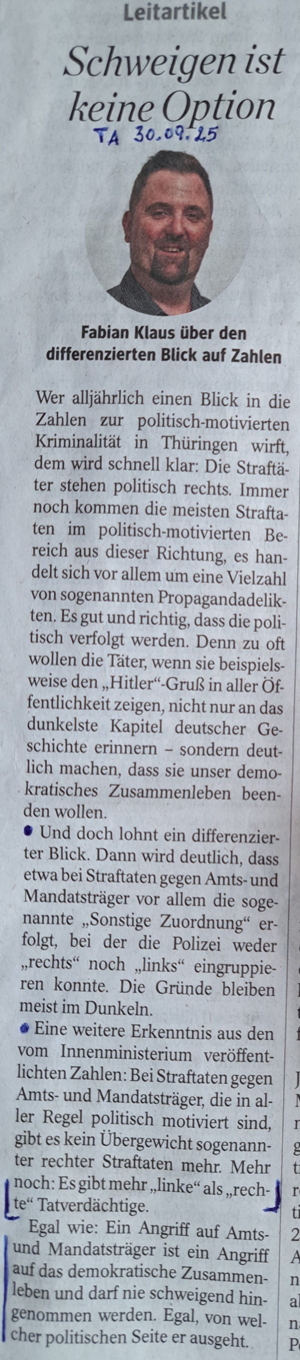Während in unserem Land die Politiker über das Wie einer stabilen Landesverteidigung streiten und deutsche Soldaten an der NATO-Außengrenze Litauen militärisch unterstützen, fliehen Millionen ukrainische Menschen im verteidigungsfähigen Alter nach Deutschland. Haben diese Flüchtlinge kein Interesse daran, ihr Land vor dem Aggressor zu verteidigen, um es dann schluss- endlich eigenhändig wieder aufzubauen? Da muss die Frage schon erlaubt sein: Welchen Stellen- wert hat unsere Solidarität noch in der Ukraine? ___ P. Achim Tettschlag, Erfurt ***