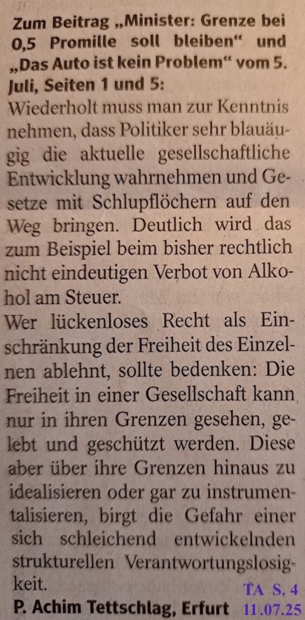 Meine Auffassung habe ich der Redaktion der Regionalpresse zur Kenntnis gegeben: