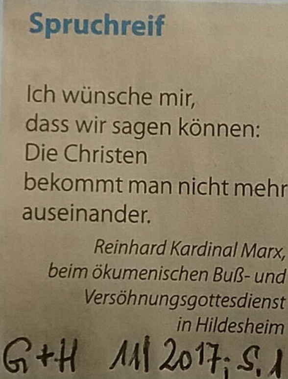 “ … Die Christen bekommt man nicht mehr auseinander“, so Reinhard Kardinal Marx anlässlich eines ökumenischen Buß- und Versöhnungsgottesdienstes in Hildesheim. Wie recht der kirchliche Würdenträger bezüglich der gewachsenen Gemeinsamkeiten zwischen katholischer und evangelischer Kirche doch hat: Was die beiden großen Kirchen hierzulande nicht zu verhindern vermögen, das s e g n e n sie – so auch die unverminderten Waffenexporte und Auslandsmilitäreinsätze.
