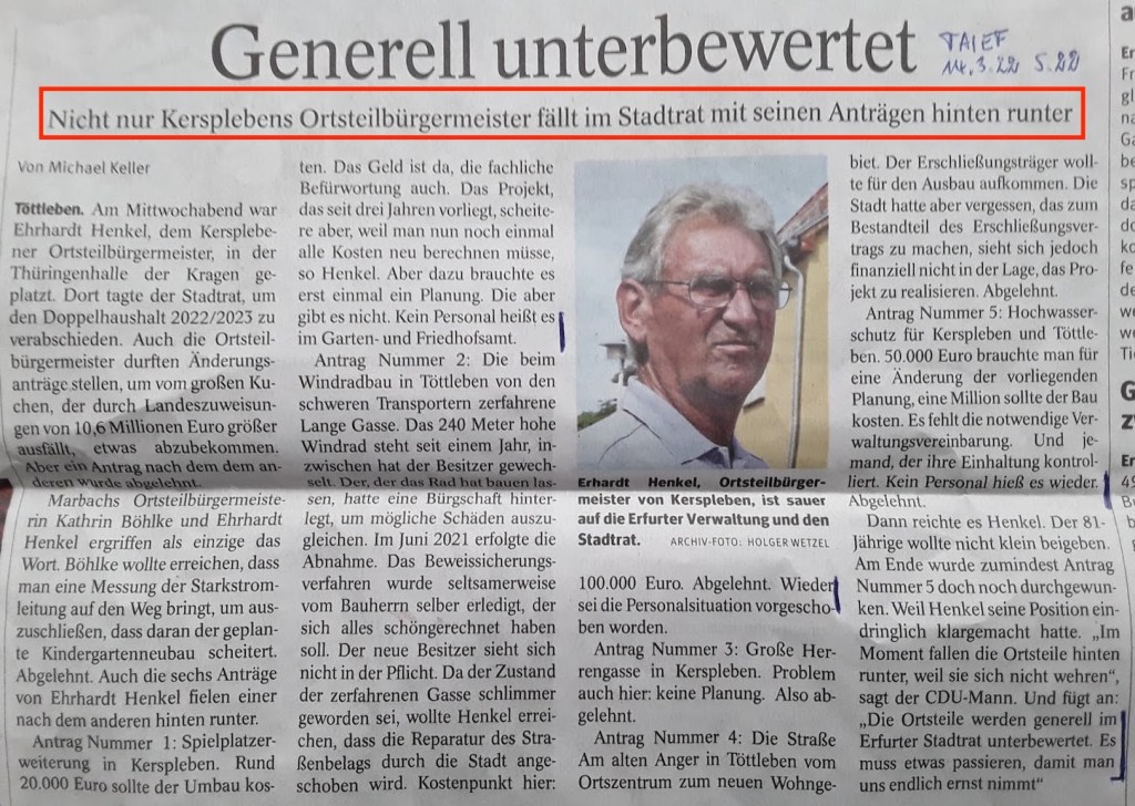 PERSONALMANGEL in der Erfurter STADTVERWALTUNG wird als Begründung zur ungerechtfertigten UNTERBEWERTUNG der berechtigten ANLIEGEN der ORTSTEILE angeführt.