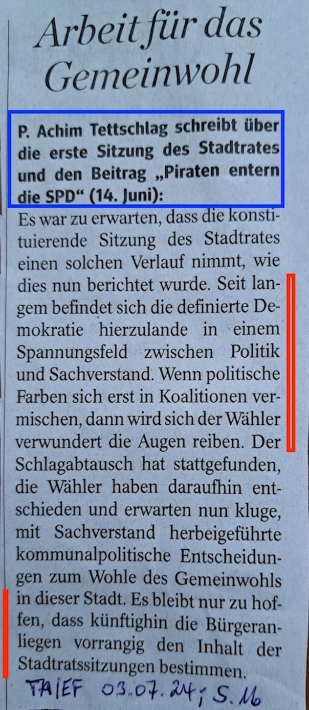 Meine Auffassung fand in der Regionalpresse ihren Platz: Eine dem Gemeinwohl verpflichtete KOMMUNALPOLITIK ist der AUFTRAG an den STADTRAT, der somit jedwede parteipolitische STÖRUNG unterbinden muss.