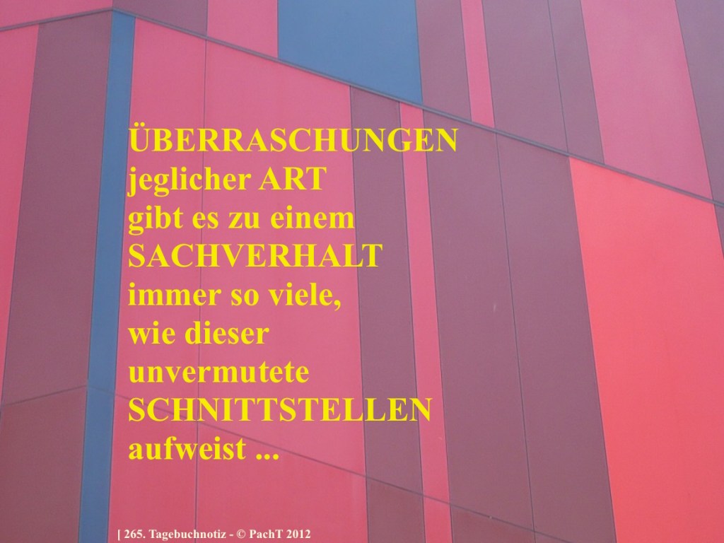"Alle WISSENSCHAFTEN können uns über das JENSEITS nichts mitteilen", las ich neulich. Ich meine, dass zum einen das große GEHEIMNIS irdischen LEBENS hier begründet liegt; zum anderen lässt es vermutete oder existierende GRENZEN Jahrtausende dauernder geistiger ARBEIT erkennen ... ___ © PachT 2012 ___