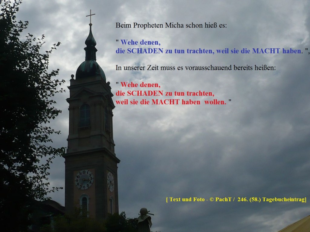 "Wehe denen, die SCHADEN zu tun trachten, weil sie die MACHT haben ... ", In unserer Zeit muss es vorausschauend bereits heißen: "Wehe denen, die SCHADEN zu tun trachten, weil sie die MACHT haben wollen ... " ___ © PachT 2012 Gedanken über den Bibeltext in Micha 2,1 im Zusammenhang mit der politischen Diskussion über die Glaubwürdigkeit des Bundespräsidenten Christian Wulff ___