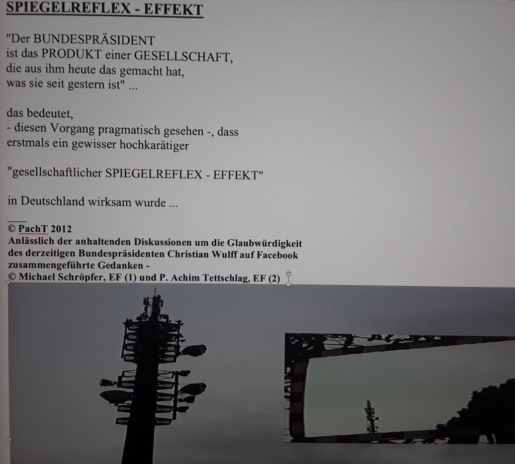 "Der BUNDESPRÄSIDENT ist das PRODUKT einer GESELLSCHAFT, die aus ihm heute das gemacht hat, was sie seit gestern ist" ... das bedeutet, - diesen Vorgang pragmatisch gesehen -, dass erstmals ein gewisser hochkarätiger "gesellschaftlicher SPIEGELREFLEX - EFFEKT" in Deutschland wirksam wurde ... ___ © PachT 2012 Anlässlich der anhaltenden Diskussionen um die Glaubwürdigkeit des derzeitigen Bundespräsidenten Christian Wulff auf Facebook zusammengeführte Gedanken - © Michael Schröpfer, EF (1) und P. Achim Tettschlag, EF (2) ___