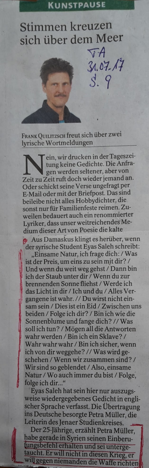 Am Sonntag, 30. Juli 2017, berichtete das Fernsehen über die bewegende Trauerfeier für die zwei verunglückten Piloten eines Militärhubschraubers im Krisengebiet Mali. Am darauffolgenden Tage veröffentlicht die “TA“, die zwar kein Poesiealbum sei, aber doch Schöngeistigem schon mal einen Platz einräume, das Gedicht eines syrischen Studenten.