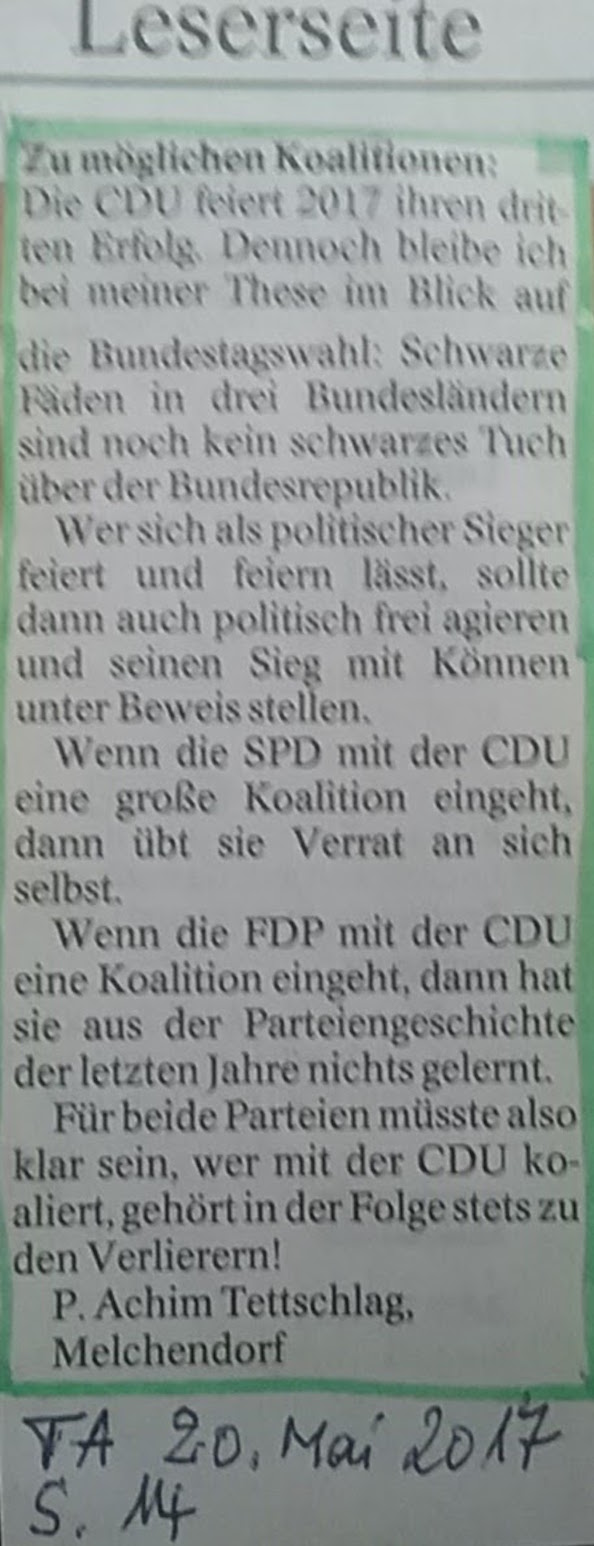 Die CDU feiert 2017 ihren dritten Erfolg. Dennoch bleibe ich bei meiner These im Blick auf die Bundestagswahl: “ Schwarze “ Fäden in drei Bundesländern sind noch kein “ schwarzes “ Tuch über der Bundesrepublik.