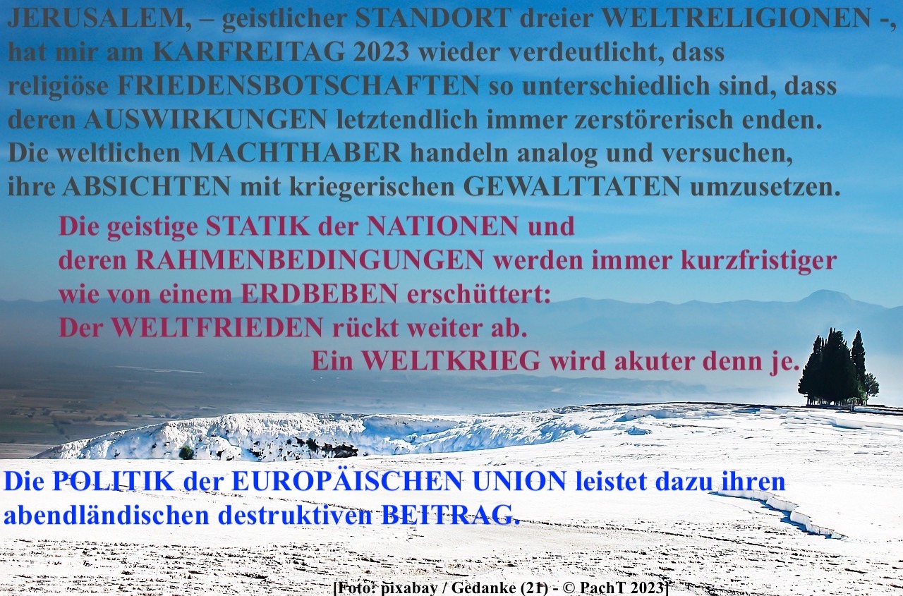 Er, – Gott -, weiß die Antworten auf unsere brennenden Fragen, doch wir haben verlernt, aufmerksam zuzuhören. Herzlosigkeit ist eine Folge, die die Menschheit nun mehr und mehr heimsucht. Ein Weltkrieg rückt näher als der Weltfrieden.